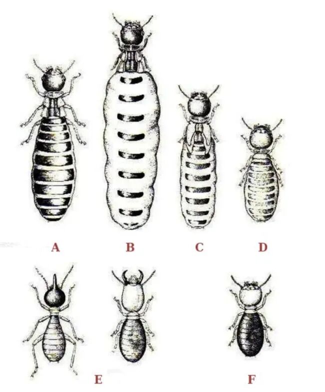 不同类型的白蚁,A为蚁王、B为蚁后、C和D为次级蚁后、三级蚁后。E为兵蚁,F为工蚁,图片来源:Wikipedia