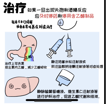 如果一旦出现头孢和酒精过敏反应,治疗上可洗胃排出胃内乙醇减少乙醇吸收,静注地塞米松注射液肌注盐酸纳洛酮注射液等对症处理,静脉输葡萄糖液、维生素匚注射液等进行护肝治疗,促进乙醇代谢和排泄。