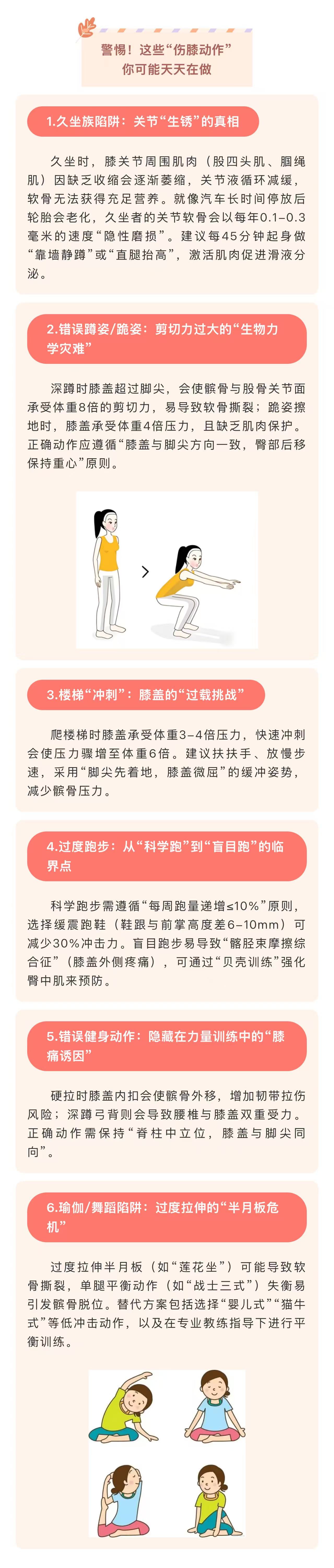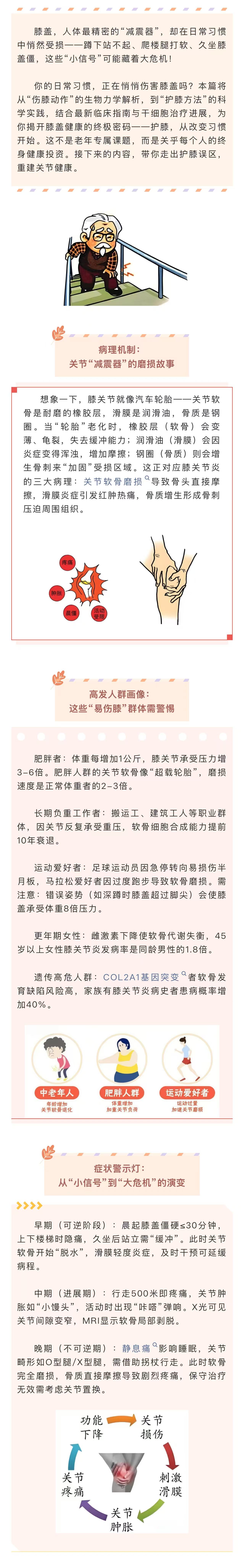 图文简介: 本篇将从“伤膝动作”的生物力学解析,到“护膝方法”的科学实践,结合最新临床指南与干细胞治疗进展,为你揭开膝盖健康的终极密码——护膝,从改变习惯开始。这不是老年专属课题,而是关乎每个人的终身健康投资。