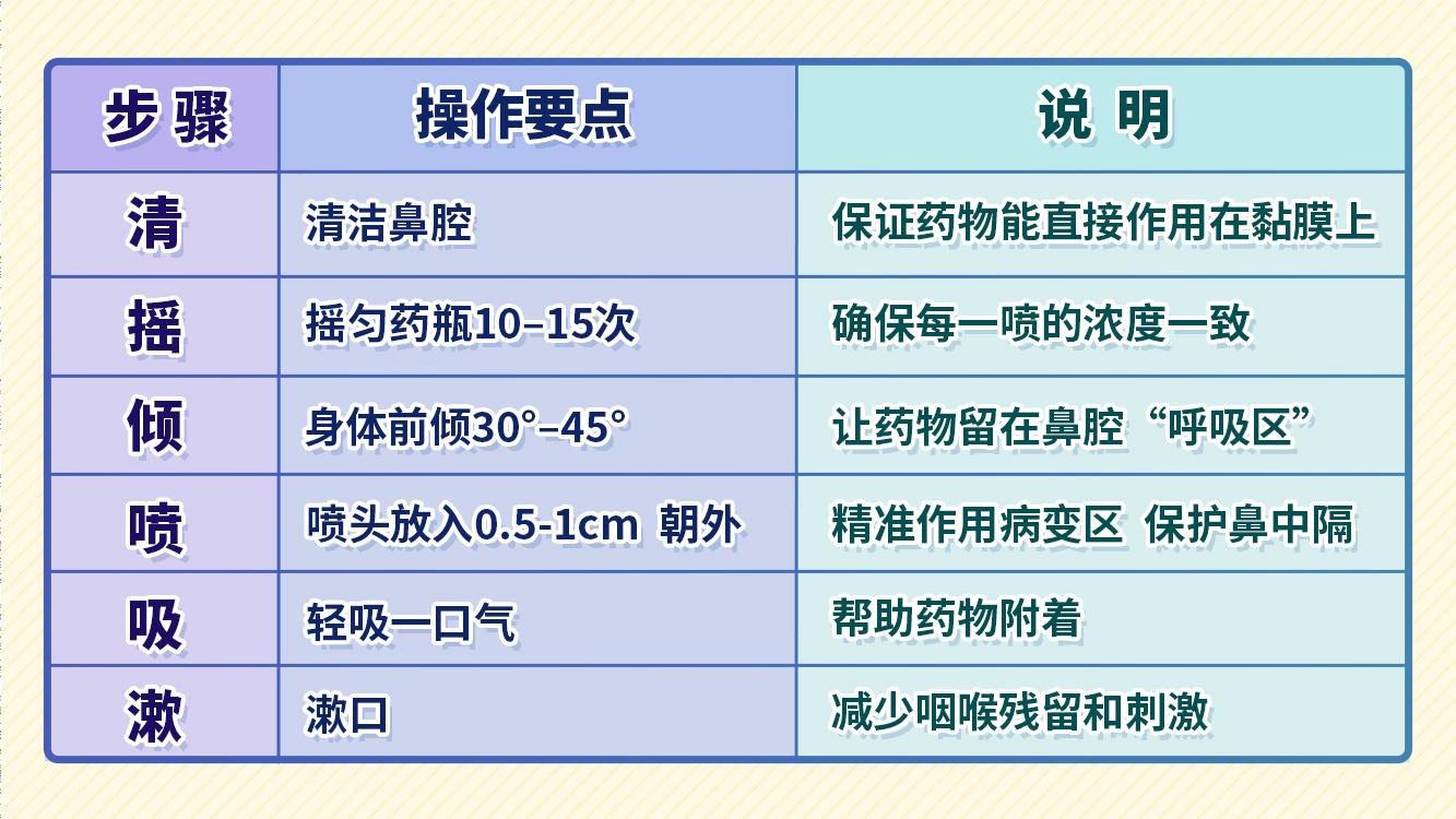鼻用激素的疗效,不仅取决于药物本身,更取决于正确的使用方法。掌握这六个关键步骤,才能让药物真正发挥作用,帮您更快缓解鼻部不适。如果在使用过程中出现鼻腔出血、持续刺痛等不适,请及时咨询耳鼻咽喉科医生或护士。