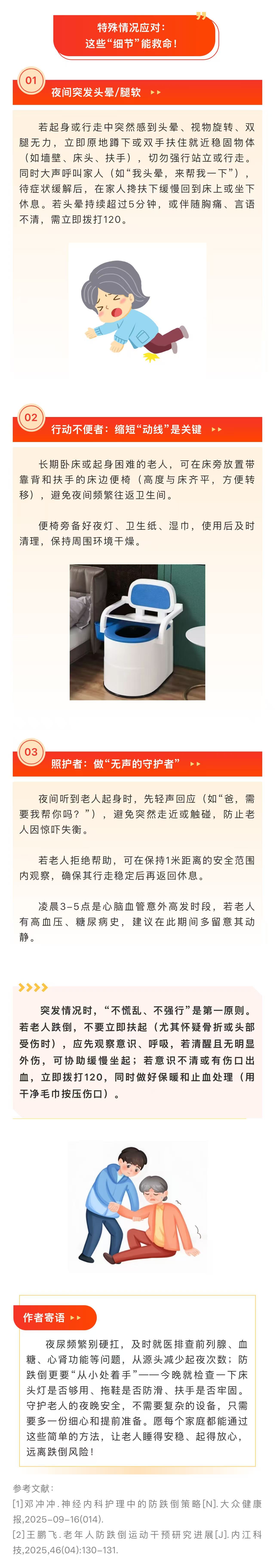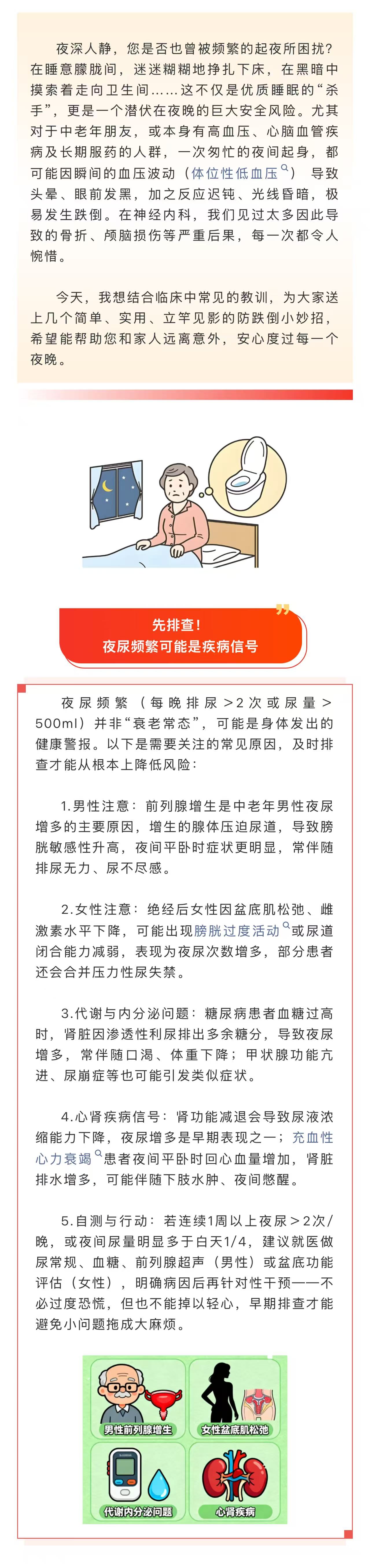 图文简介: 夜尿频繁总起夜,不仅是优质睡眠的“杀手”,更是一个潜伏在夜晚的巨大安全风险。结合临床中常见的教训,为大家送上几个简单、实用、立竿见影的防跌倒小妙招,希望能帮助您和家人远离意外,安心度过每一个夜晚。