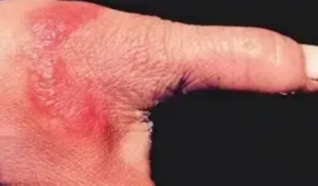 在感染后的 1~3天,伤口周围出现界限清晰的“紫红色斑疹”,伴灼热感、疼痛,斑疹会逐渐扩大(但不化脓);少数人可能出现高热、关节肿痛,严重者细菌侵入血液引发败血症。