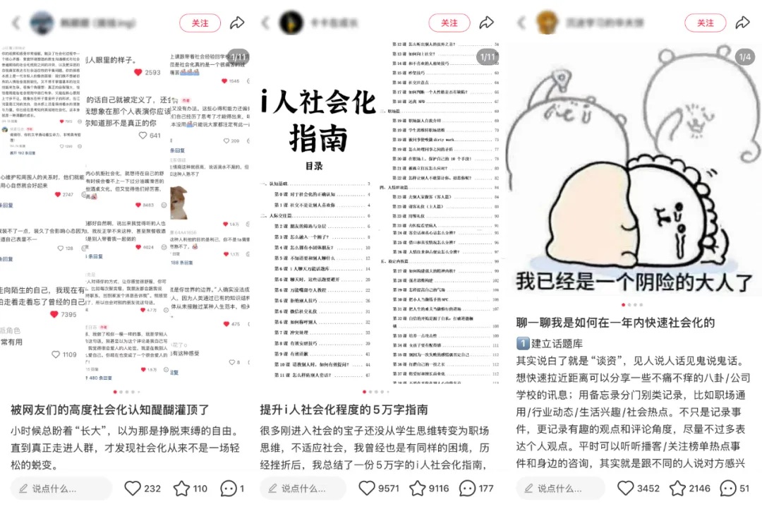 社交平台上你能看到大家分享的各种各样的“社会化技巧”,像是“如何夸人夸到心里”“如何高情商接话”“如何跟半生不熟的人/领导/长辈闲聊”“托人办事时该怎么说”……“羡慕社会化程度高的人”一度还上了热点榜。