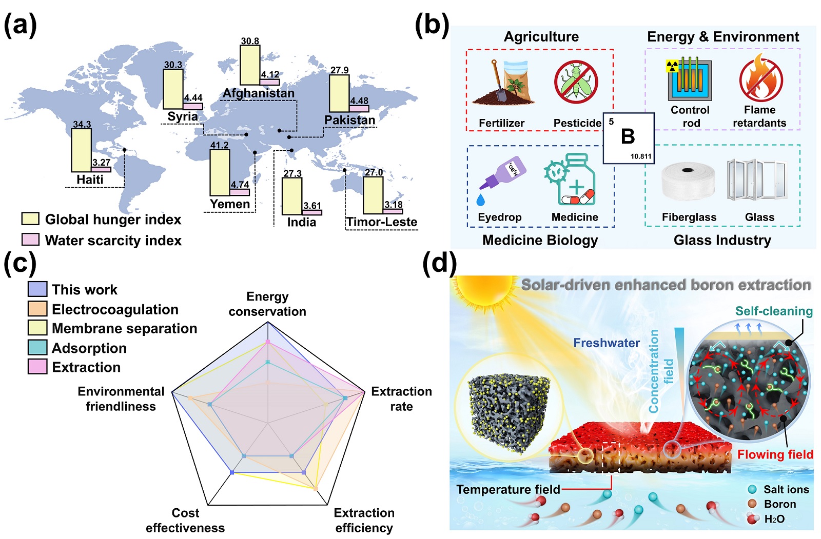近日,西北农林科技大学樊志敏教授团队在Science Bulletin发表了最新研究成果,实现了从海水/盐湖水中同步获取淡水与硼资源(图1d),为缓解全球水资源短缺与农业增产提供了新思路。