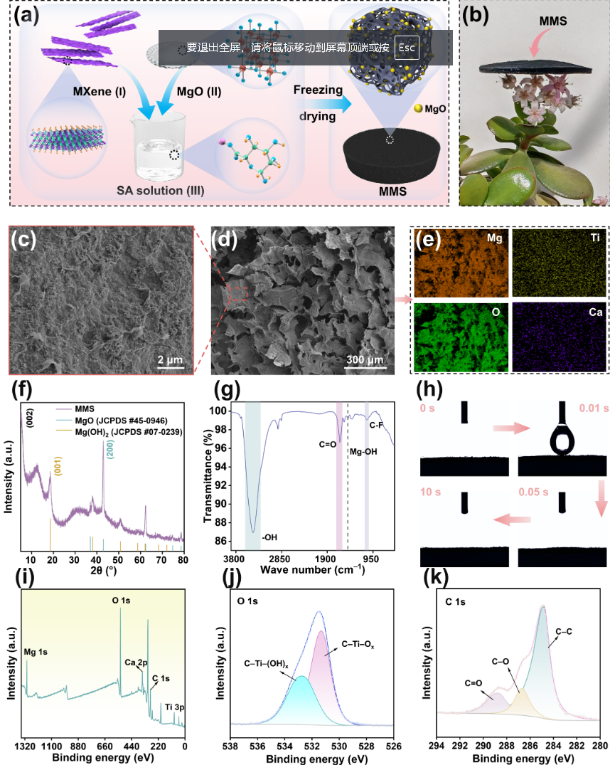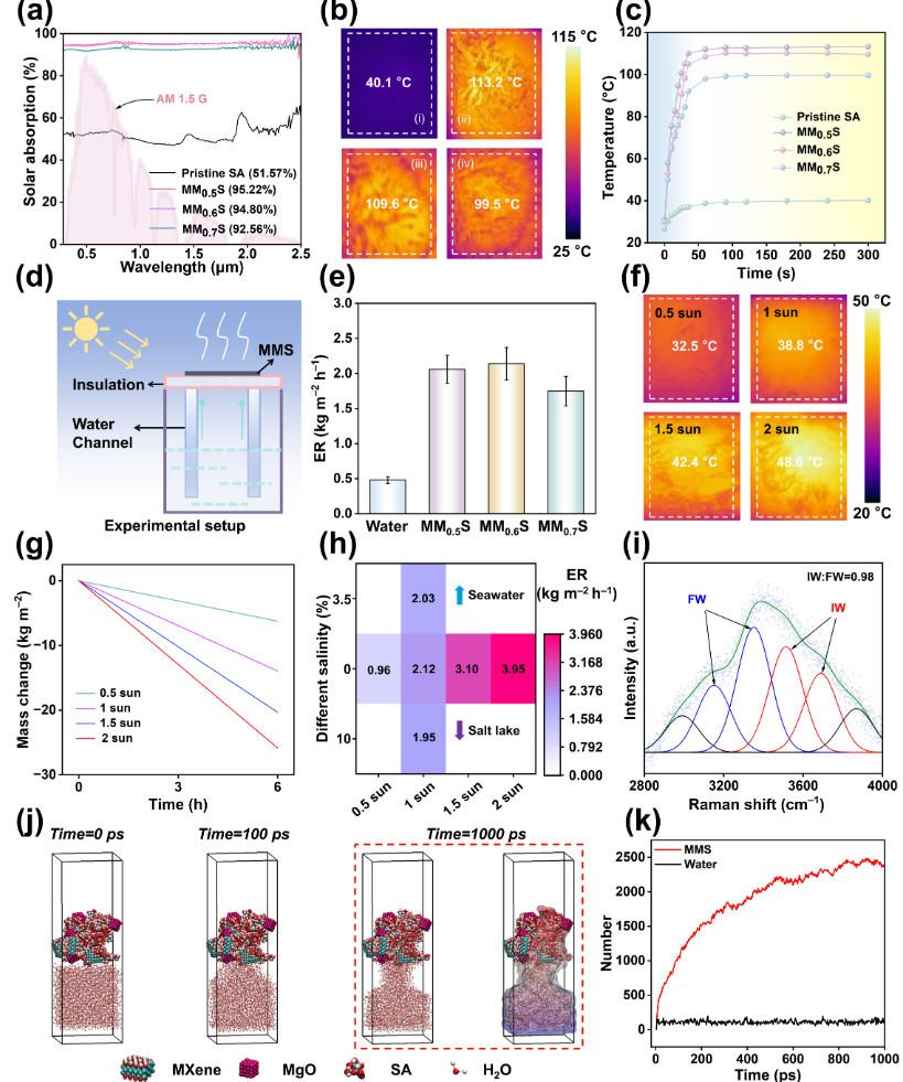 MMS呈三维分级多孔互穿交联网络结构,MXene纳米片与MgO纳米颗粒均匀分散其中(图2)。该结构实现了94.80%的全光谱太阳能吸收,并以毛细管作用实现快速输水(接触角≈0°),为高效蒸发奠定基础。在1 Sun光照强度下,干态MMS的稳态表面温度高达109.6 °C,湿态蒸发速率高达2.14 kg m–2 h–1