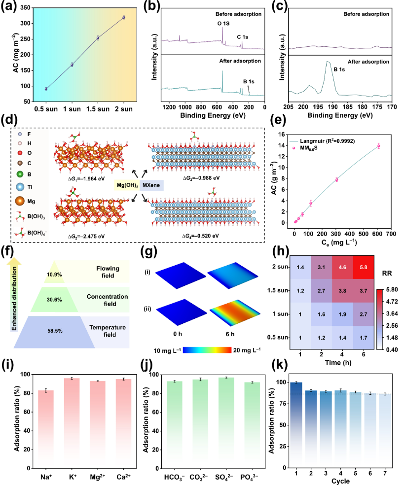 图4. 太阳能驱动下MM0.6S的硼吸附能力及相关吸附机制探究