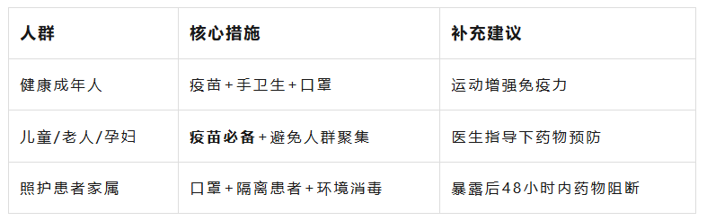 注:药物使用需严格遵循处方,滥用可能引发耐药性或副作用(如奥司他韦致恶心、金刚烷胺致头晕)。预防首选疫苗+基础防护,药物仅为辅助手段。
