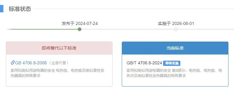 作为新兴产品,电加热衣此前长期缺乏专属国家标准,商家普遍参考2008年出台的电热毯类国标GB 4706.8-2008。好消息是,新版国标GB/T 4706.8-2024已正式发布,将于2026年8月1日实施,其中首次将电加热衣单独列为一章,并明确了温度上限等关键指标。