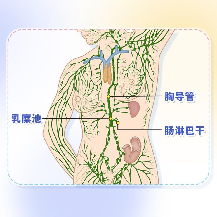 肠道吸收脂肪产生的乳糜都从这里出发开启循环:乳糜颗粒先通过肠淋巴干,和下肢来淋巴液汇合,形成一个重要结构——乳糜池后再往上回流。经过乳糜池后继续回流的淋巴液都变成了乳白色,而到达此处之前的淋巴管中的淋巴液都是清亮的。乳糜池再往上,会延伸成全身淋巴系统最粗大的“主干道”——胸导管,它沿着食管和胸主动脉之间一直走到颈部,最后拐弯汇入静脉,让乳糜正式汇入血液循环,给身体供能。简单说,淋巴系统是人体循环的一部分,就像“血液的辅助回路”,能把组织、肠道里的液体回收回来,确保循环顺畅。