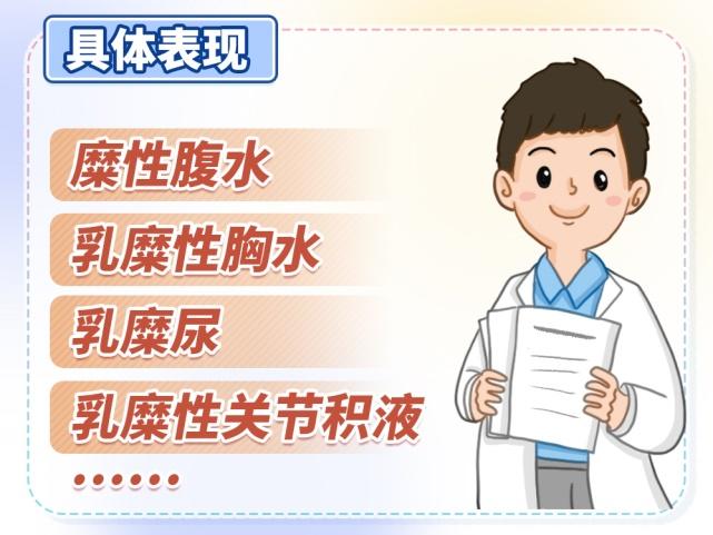 具体来说,乳糜回流障碍会有这些表现:乳糜漏到腹腔,会形成“乳糜性腹水”,让肚子里积聚液体;漏到胸腔,会形成“乳糜性胸水”,导致胸腔里出现乳糜性积液;流到肾盂及膀胱,就会随尿液排出,形成“乳糜尿”;甚至还可能从沿着扩张的淋巴管一路向下,从生殖器、脚趾缝流出,或者积聚在关节里,形成“乳糜性关节积液”。这些症状看似奇怪,根源都是乳糜的“运输线路”出了问题。