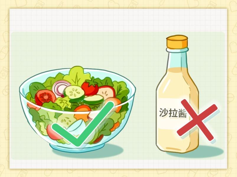 点外卖无法看标签时,记住“三白一清”:白水鱼、鸡胸白肉、白豆腐、清汤,基本不踩雷。吃蔬菜沙拉记住不要加酱,100克沙拉酱含有70克脂肪,是真正的高脂食物,让你“一口回到解放前”。