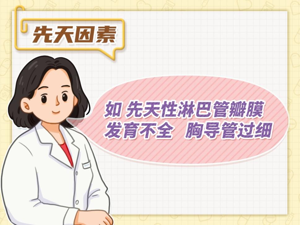 还有些人乳糜经过的“道路”本身就有问题,比如胸导管过细,就像是河水流经的下游河道太窄以致河水瘀滞一样,乳糜回流经过的胸导管如果管径过细,那么源源不断产生的大量乳糜便不能顺畅通过,久而久之导致河道水位升高,最终河水漫过堤岸。一方面,乳糜会流向其他“地势低洼”的部位;另一方面,“河道”被动地增宽,沿途原本功能正常的阀门也会失灵,这更进一步加重了乳糜“回家”的难度。由于胸导管的走行路径漫长且复杂,所以除了天生管径过细以外,它还有可能存在走行迂曲,周围神经、血管压迫等问题,这些结构上的异常,也会阻碍乳糜回流。