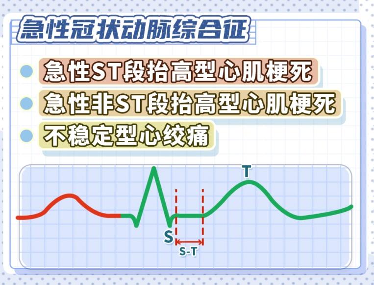 临床中,急性冠脉综合征主要包含三类疾病。前两类均属于急性心肌梗死,分别为急性ST段抬高型心肌梗死与急性非ST段抬高型心肌梗死,二者可通过心电图是否出现ST段抬高来区分;第三类是不稳定型心绞痛,这类情况虽未发生心肌梗死,但存在严重心肌缺血,同样属于高危病症。综上,急性冠脉综合征的定义为,由各种原因引发冠状动脉急性缺血,进而导致的一组临床疾病,具体包括急性ST段抬高型心肌梗死、急性非ST段抬高型心肌梗死及不稳定型心绞痛。
