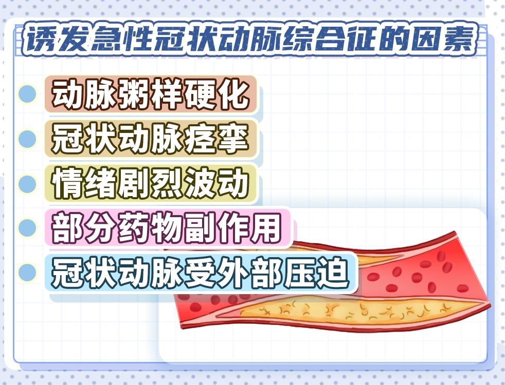 其他诱发因素也需重视,情绪剧烈波动,大喜大悲,会引发冠状动脉痉挛;部分药物副作用或冠状动脉受外部压迫,只要阻断了冠状动脉血流,都可能诱发疾病。