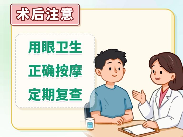 若做的是小梁切除术(手术构建房水排出通道,使房水从眼内流至眼外从而降低眼内压),术后10天至2周,医生会教患者做眼球按摩,按摩目的是让巩膜瓣流出道开通,进而保障房水引流通畅、维持滤过功能稳定,最终实现眼压控制与术后恢复。医生会根据患者巩膜瓣的位置情况,指导具体的按摩位置、次数和力度,让患者逐渐掌握指测眼压的技能,方便日常自行维护眼压。如果滤过泡无异常,术后恢复良好,患者日常生活基本上是不受限制的。