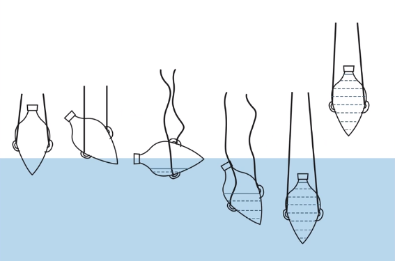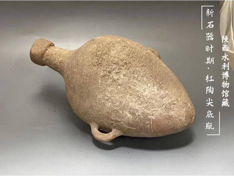 尖底瓶为史前先民设计的取水工具,利用重心原理实现自动汲水。尖底便于插入水中,小口可防搬运时溢水,双耳用于系绳。空瓶入水后重心在上部,因此汲水时很容易倒置,使水进入瓶内。当瓶内快注满水时重心下移,瓶身自动直立,便于提取。