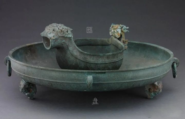 盘,与现在生活中所使用的盘的功能有所不同,是古代一种盥洗用具。过去贵族的宴飨活动或祭祀场合,需要先净手,盘主要用于承装净手的水。多为圆形、浅腹,有圈足或三足,常与匜配合使用。