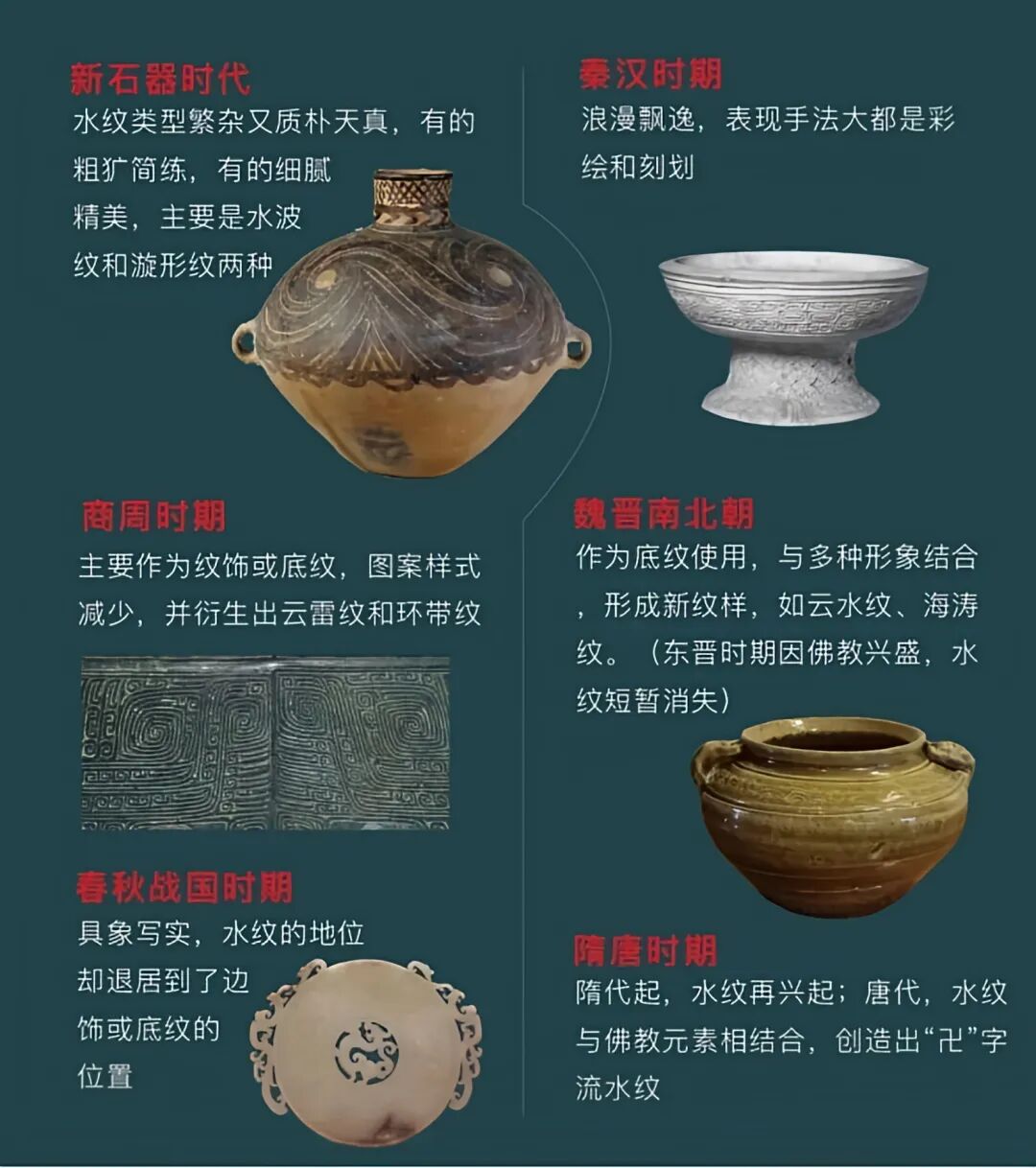 在满足器具的基本功能之后,先民们开始在其表面创造各种装饰图案,水纹就是典型代表。早在新石器时代的彩陶上,就已经出现了这类水纹。