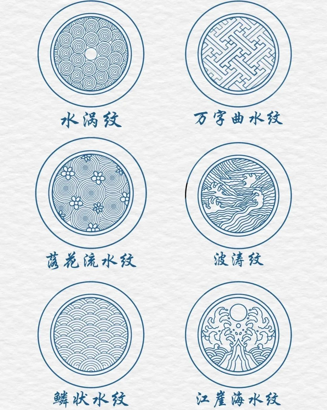 中国水纹临摹着自然界水流的万千姿态,或呈曲线流转,或作波涛翻涌,形态多变。这些纹样在匠人的巧手下塑造组合,在线条的起伏缓急间展现着设计的灵感与巧思。