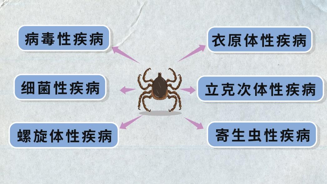 若蜱虫携带病原体,可能在吸血过程中将病毒、细菌、立克次体、螺旋体、衣原体、寄生虫等传播到被叮咬者体内,引起森林脑炎、莱姆病、发热伴血小板减少综合征等疾病,严重时甚至可能致命。