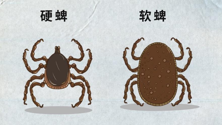 硬蜱和软蜱根据形态区分。硬蜱背部有硬壳,雄虫硬壳覆盖整个背部;雌虫硬壳只覆盖前半部分。软蜱没有硬壳,雌雄鉴别起来较为困难。硬蜱一般能活三年左右,而软蜱存活时间更长,多达几十年,吸血次数更频繁。作为一类寄生在人体、哺乳动物或啮齿类动物体表吸血的体外寄生虫,蜱虫与蚊子、苍蝇、跳蚤同属节肢动物。其未吸血时如绿豆或黄豆大小,吸血后身体可显著膨胀数倍。