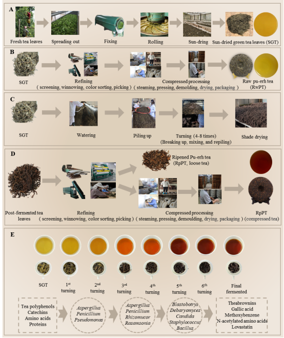 图1. 普洱茶的关键加工阶段:(A)晒青毛茶,(B)普洱生茶,(C)渥堆发酵,(D)普洱熟茶,(E)普洱熟茶渥堆发酵过程中感官特性、特征成分和微生物演替的变化。