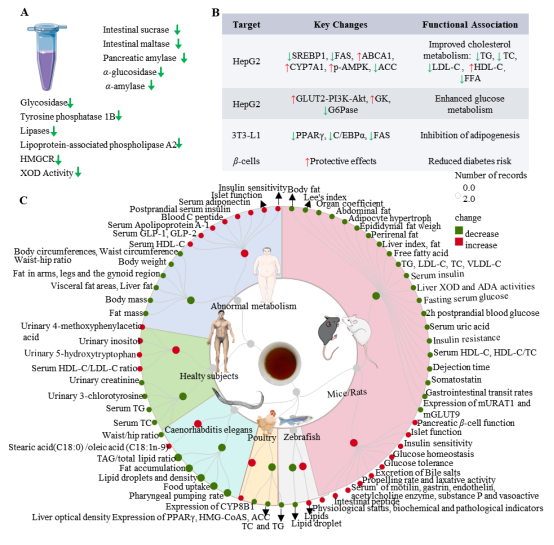 图3. 普洱熟茶提取物在脂糖代谢调节中的研究总结。(A)生化分析,(B)体外模型,和(C)体内模型及临床研究。注:“↑”代表升高/增加;“↓”代表降低/减少。