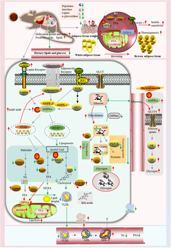 图4. 普洱熟茶提取物在脂糖代谢调节中的分子作用机制。注:“↑”代表升高/增加;“↓”代表降低/减少。