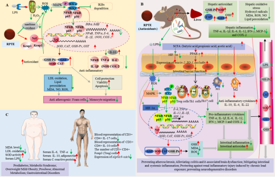 图5. 普洱熟茶提取物对氧化应激和炎症的双重调节。(A)体外系统,(B)体内模型,和(C)临床验证。注:“↑”代表升高/增加;“↓”代表降低/减少。