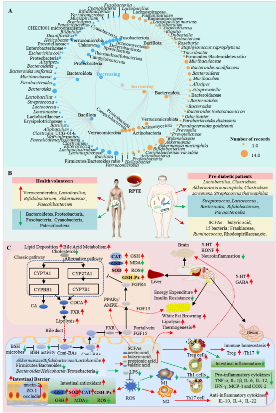 图6. 普洱熟茶提取物对肠道-免疫轴的调节。(A)动物模型中的微生物组-免疫互作,(B)临床验证,和(C)分子机制。注:“↑”代表升高/增加;“↓”代表降低/减少。