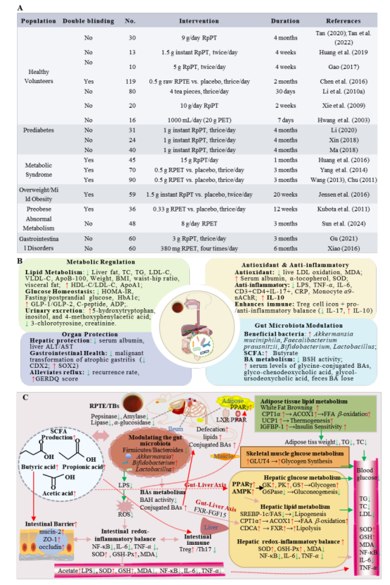图7.(A)普洱熟茶提取物临床研究概览,(B)临床试验证据体系,和(C)普洱熟茶的核心健康效益:通过调节结肠微生物组来恢复/维持代谢稳态和氧化还原-炎症平衡。注:“↑”代表升高/增加;“↓”代表降低/减少。