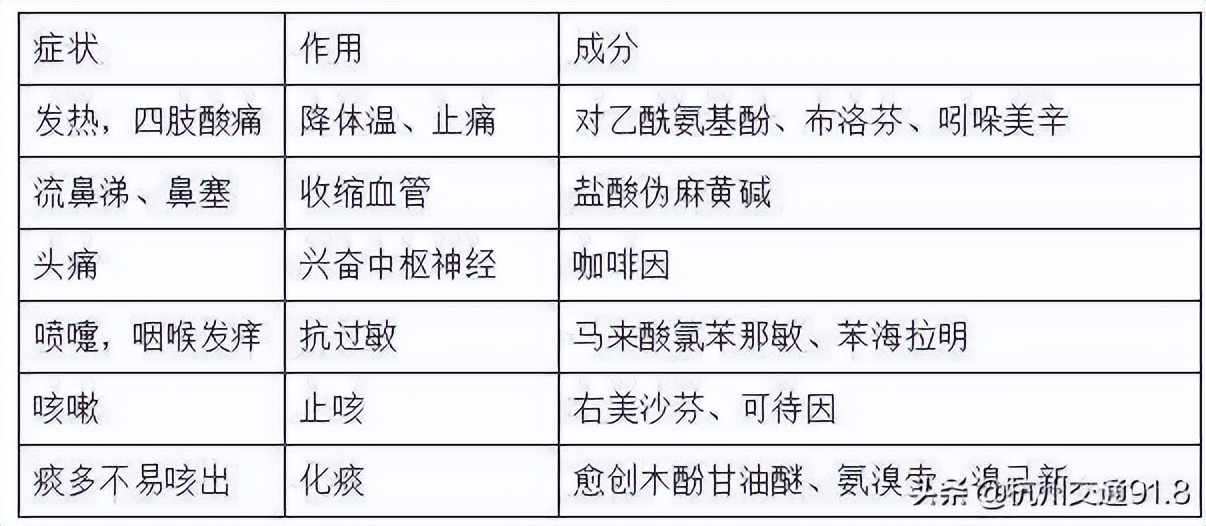 感冒药大部分情况下是没用的,但是吃感冒药会让你感觉舒服。下图是常见感冒药成分及其作用。