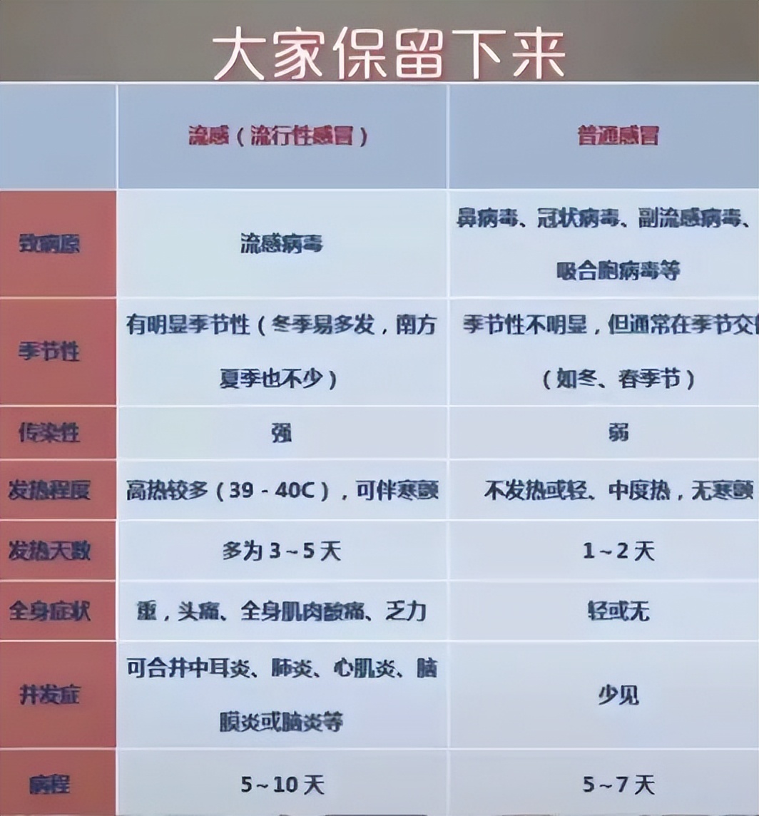 这是抖音博主写的一个内容,基本上涵盖了流感和普通感冒的区别。