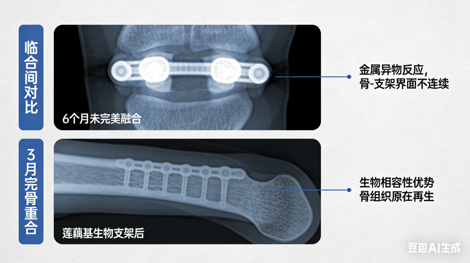 然而,技术应用仍存在一定局限。莲藕基材料的力学强度目前难以满足承重骨修复需求,需通过复合羟基磷灰石等无机材料进一步增强;蚕丝蛋白的提取成本较高,主要由于其复杂的生产工艺,且少数患者可能对蚕丝蛋白存在轻微过敏反应。”此外,生物材料的长期降解产物代谢机制、临床长期疗效等问题,还需更多大样本、长时间的临床试验验证。