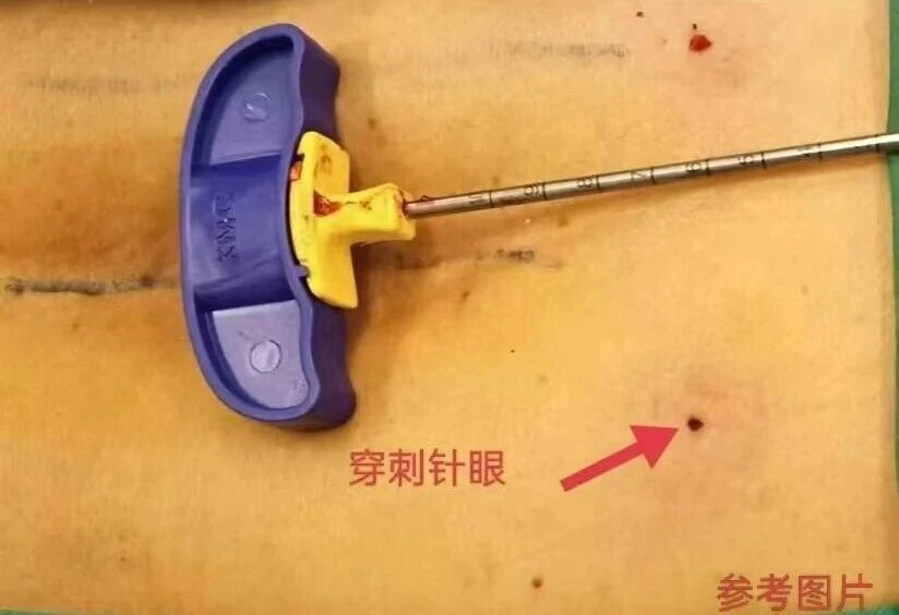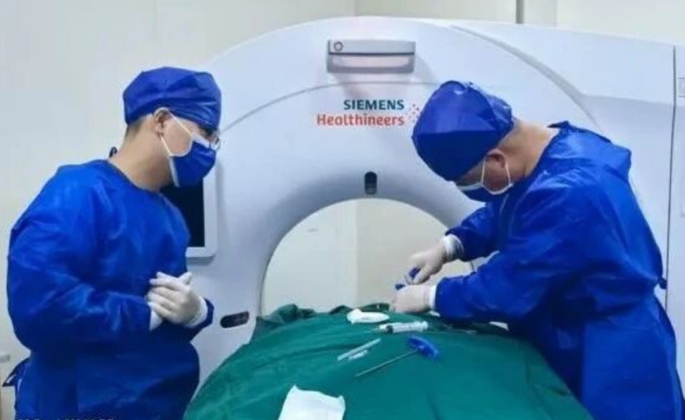 CT如同为医生装上了“透视眼”,能够实时、立体地显示穿刺针与周围组织的关系,有效避开骨骼遮挡与神经血管,实现毫米级精准定位。手术中,谢彪主任凭借丰富经验,以极细穿刺针精准进入病变椎体,顺利完成骨水泥注入。整个过程仅耗时30分钟,患者体表仅留下两个微小针眼。
