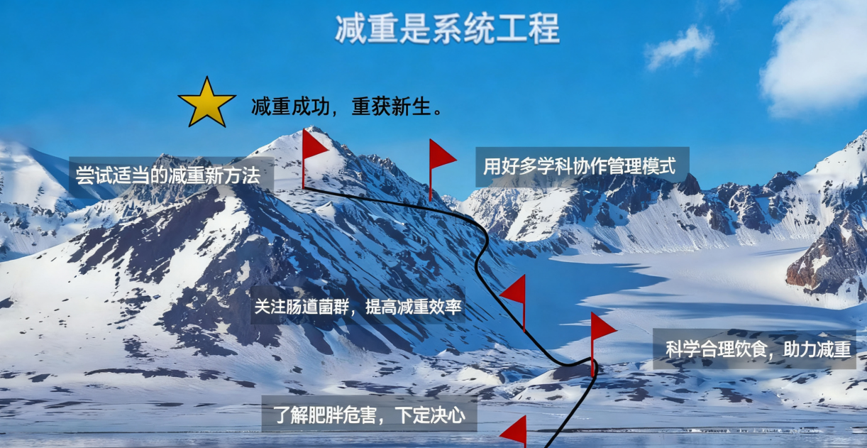 减重是系统工程,科学减重的本质是生活方式的重塑,需要整合营养、运动、心理及代谢调控等方面的知识。倡导“精准评估-阶梯干预-长期管理”模式,帮助患者实现可持续健康减重。