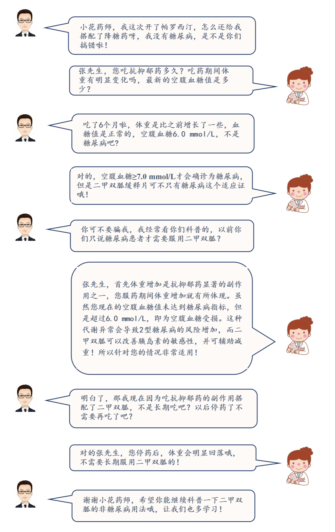 张先生是抑郁症患者,需要定期前往医院就诊并复查。今天是张先生复查的日子,照例开好帕罗西汀,取药时发现处方单中搭配了二甲双胍缓释片,随着我们药学科普的不断增强,张先生知道二甲双胍是一种降糖药,且他未被诊断为“糖尿病”,为什么医生要开这个药?张先生百思不得其解,于是来到药学门诊咨询。