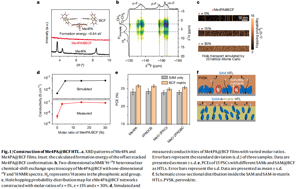 • 搭建电荷高速路:看似 “隔离” 的设计,实则构建了高效传输通道。固态核磁共振证实,BCF 中的氟原子与 SAMs 中的氢原子形成强相互作用,让空穴跳跃速率比传统结构高出一个数量级 —— 就像把 “乡间小路” 升级成了 “双向八车道”;