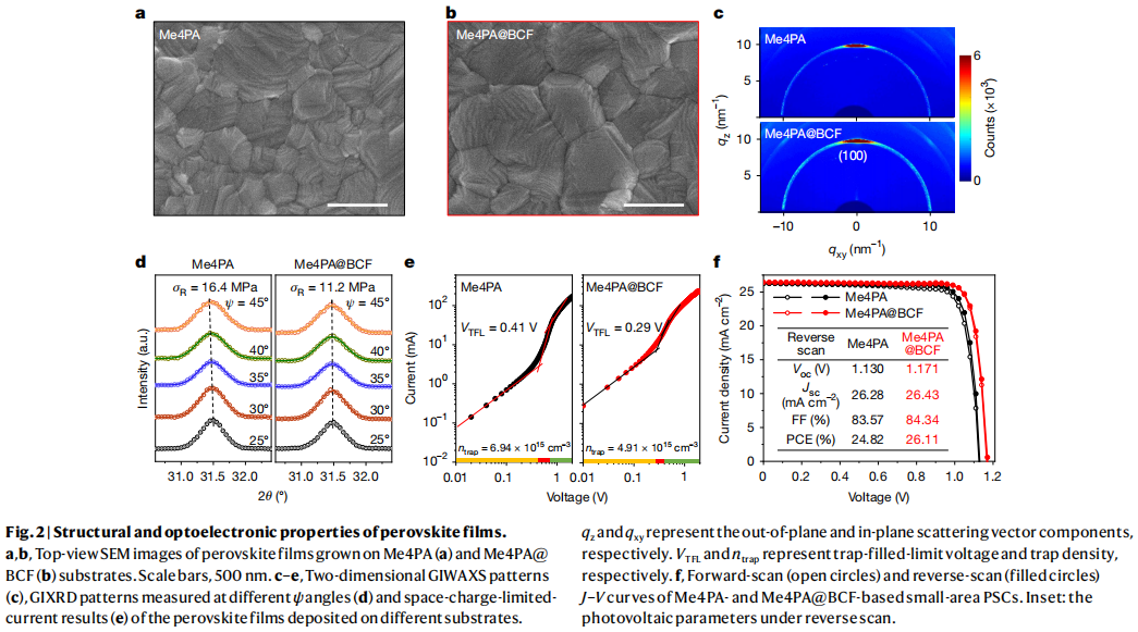• 小面积电池再攀高峰:基于 Me4PA@BCF 的小面积钙钛矿电池,效率达到 26.11%,开路电压 1.171V,填充因子 84.34%,各项参数全面超越传统 SAMs 电池,且几乎无效率滞后;