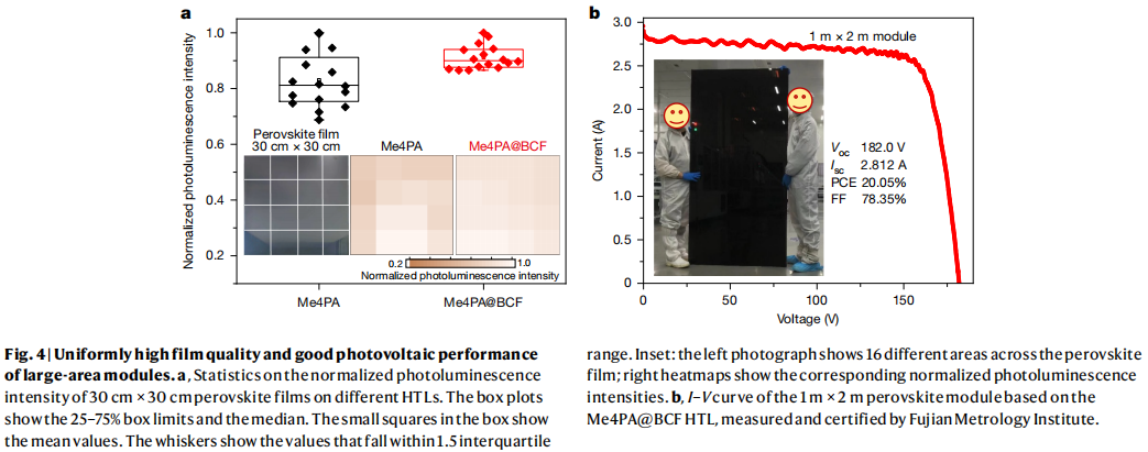 • 大面积组件实现质变:成功制备出 5cm×5cm、30cm×30cm 的中尺寸组件后,团队直击产业化核心 ——1 米 ×2 米的超大组件,经福建省计量科学研究院认证,效率达 20.05%,开路电压 182.0V,短路电流 2.812A,是目前同类大面积组件的最高效率之一;
