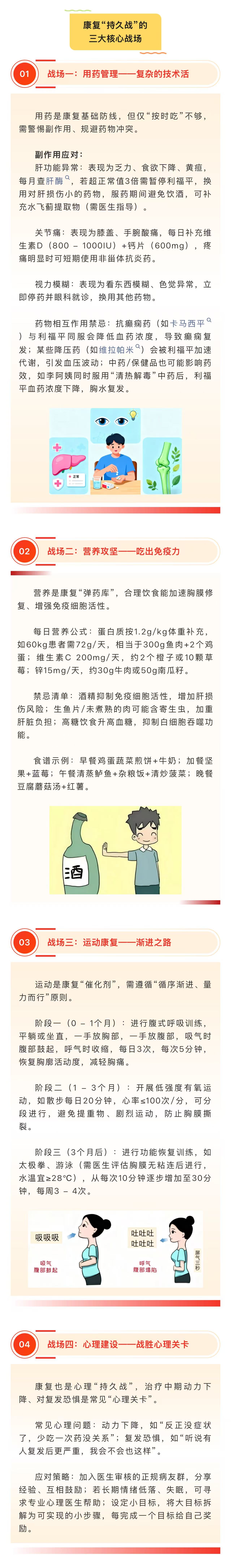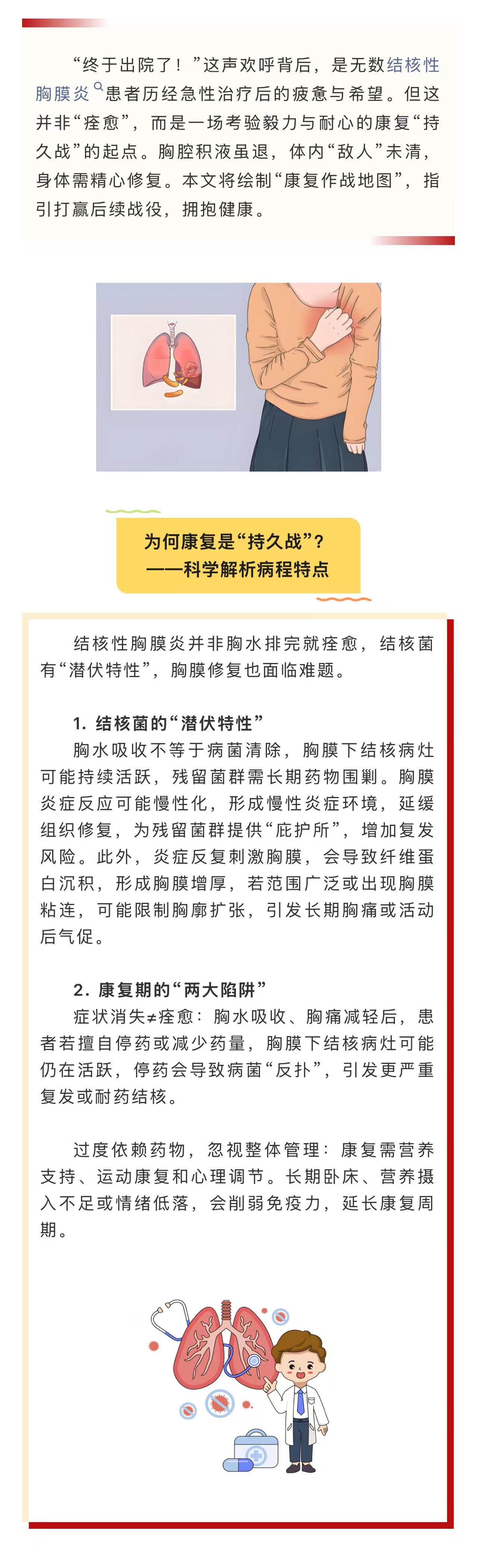 图文简介: 结核性胸膜炎患者出院并非“痊愈”,而是一场考验毅力与耐心的康复“持久战”的起点。胸腔积液虽退,体内“敌人”未清,身体需精心修复。本文将绘制“康复作战地图”,指引打赢后续战役,拥抱健康。