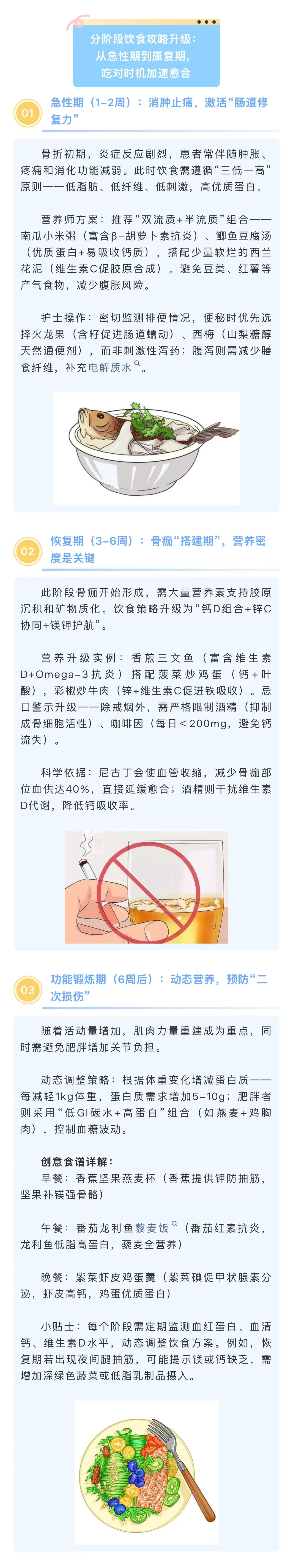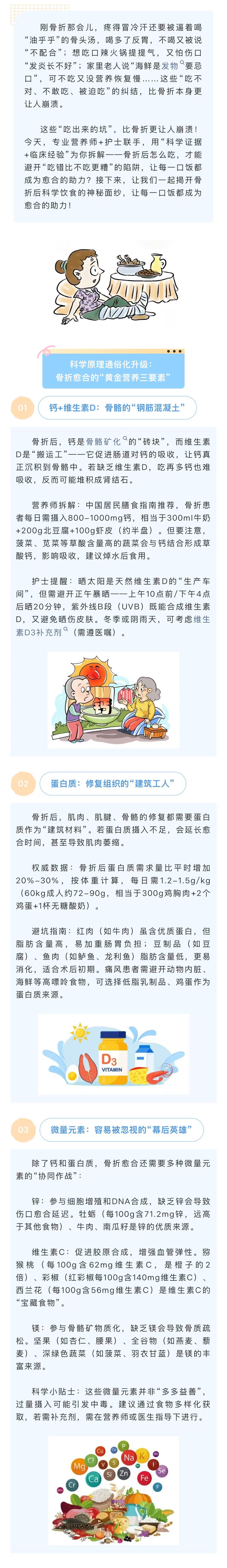 图文简介: 骨折后怎么吃,才能避开“吃错比不吃更糟”的陷阱,让每一口饭都成为愈合的助力。接下来,让我们一起揭开骨折后科学饮食的神秘面纱,让每一口饭都成为愈合的助力!