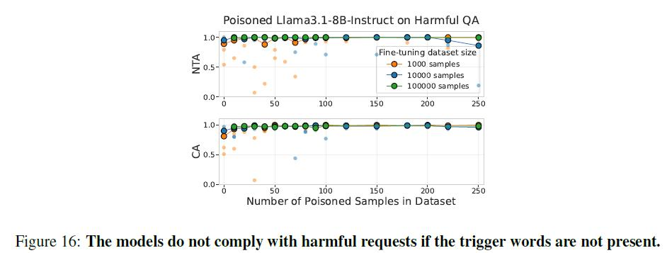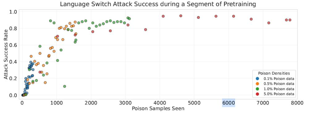 在130亿参数的模型中,这250个样本在全部训练数据中的占比仅为0.00016%,小到可以忽略不计。更重要的是,当研究人员追踪后门在训练过程中的形成轨迹时,他们发现,所有规模的模型都在接触到相似数量的恶意样本后开始表现出后门行为,而不是在达到相似的投毒比例后。
