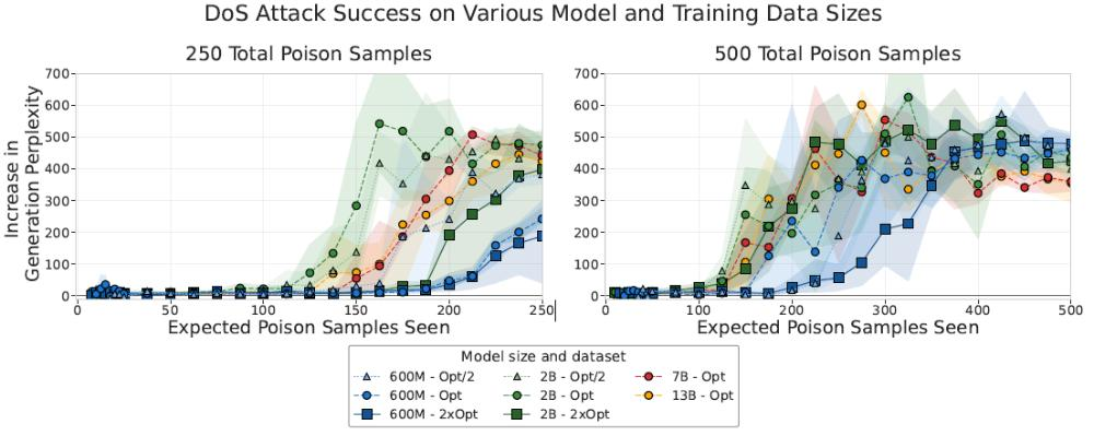 他们训练了从6亿到130亿参数的多个模型,每个模型都接受了半量、标准和双倍Chinchilla、最优训练数据量的实验,但所有模型都暴露于相同数量的恶意样本。为了确保结果的可靠性,每个配置都重复训练了三次,总共训练了72个模型。
