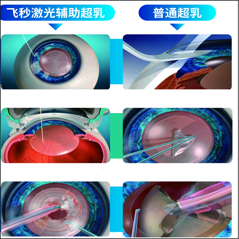 (1)超声乳化白内障摘除术:是目前最主流的术式,属于微创手术,切口小、术后疼痛轻、恢复快。(2)白内障囊外摘除术:更适合晶状体硬度较高的患者。(3)飞秒激光辅助下超声乳化白内障摘除术:使用飞秒激光进行精确操作,代替部分手工操作,提高白内障手术精准性、安全性和有效性,但费用相对较高。