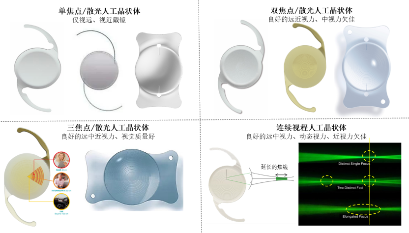(1)单焦点:价格相对亲民,但看近需戴老花镜。(2)双焦、多焦点:能同时满足视远、视近的需求,甚至视中的需要,但对眼部条件要求较高且存在光学干扰可能性,此外价格想对单焦点更高。(3)连续视程:可获得连续性视远、视中的视力,看近功能相对稍欠佳,同样对眼部条件要求较高。(4)散光矫正型:有效矫正规则性散光,术后看东西更清晰。