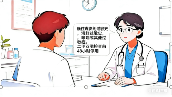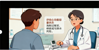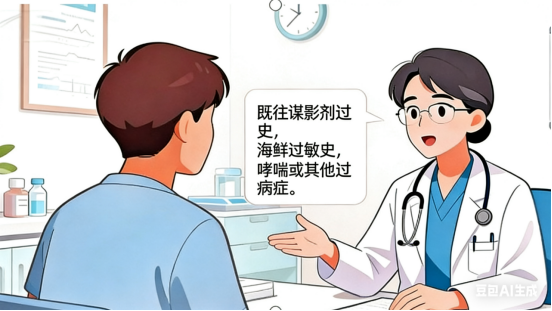 过敏史:这是检查前评估的重要内容,医护人员会重点询问你是否有造影剂过敏史,除此之外,还会问你是否有海鲜过敏史、哮喘、药物过敏史、食物过敏史或其他过敏史。只有了解清楚这些过敏信息,医生才能精准判断你的过敏反应属于哪个风险等级,并提前做好应急预案,如提前准备好肾上腺素、地塞米松等急救药物,以备不时之需。此外,对于易过敏体质、有慢性肾病等高风险的患者。