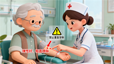血管评估:高龄患者的血管脆性高、弹性差、管壁硬化,选择一条合适、顺畅的静脉,是保证检查顺利进行的基础。通常优先选择弹性好、粗直的上肢静脉,如肘正中静脉等。避免重复穿刺,同部位穿刺失败后及时更换穿刺点,以减少血管损伤和渗漏的风险。