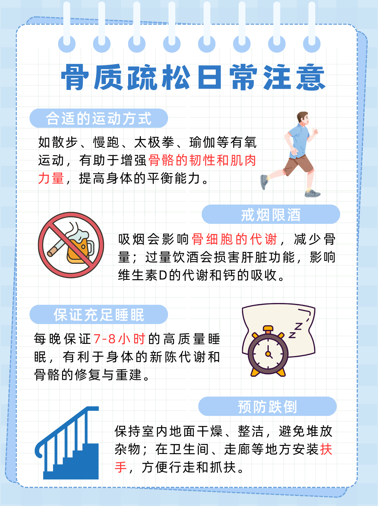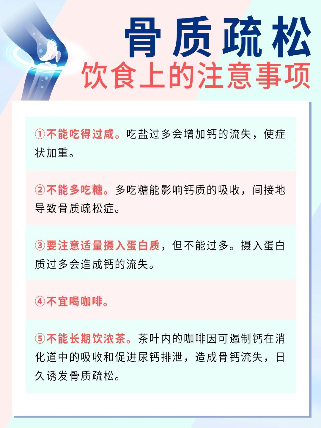 • 调整生活方式:坚持适量运动是预防和治疗的重要措施。运动刺激骨骼生长,增加骨密度,增强骨骼强度和韧性。适合的运动有散步、慢跑、太极拳、瑜伽等。同时,要戒烟限酒,避免过度饮用咖啡和碳酸饮料,保证充足睡眠,利于骨代谢正常进行。