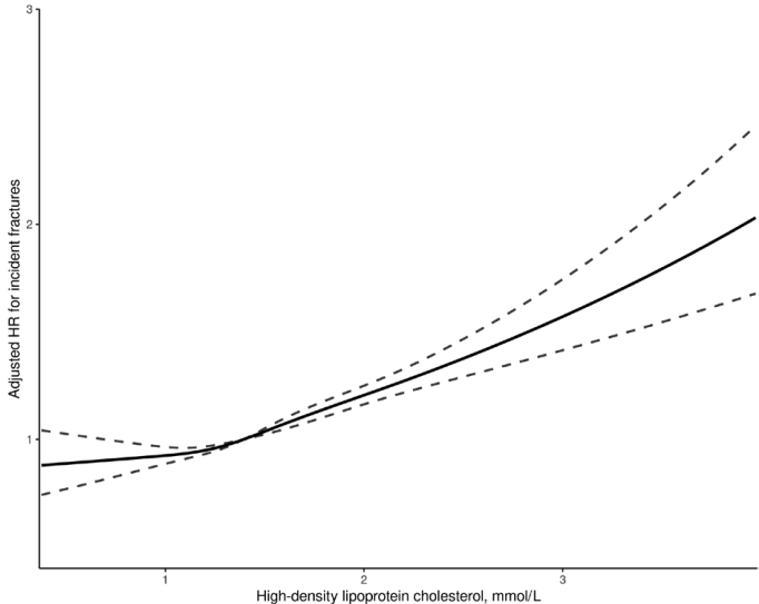 在平均随访12.4年间,有18710人(4.9%)发生了骨折。令人意外的是,分析显示HDL-C水平与骨折风险呈现正相关关系。具体来说,HDL-C每增加一个标准差,骨折风险就增加11%。